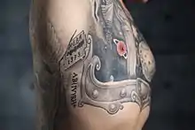 SS blood group tattoos (German: Blutgruppentätowierung) were worn by members of the Waffen-SS in Nazi Germany during World War II to identify the individual's blood type. After the war, the tattoo was taken to be prima facie, if not perfect, evidence of being part of the Waffen-SS, leading to potential arrest and prosecution. This led a number of ex-Waffen-SS to shoot themselves through the arm with a gun, removing the tattoo and leaving scars like the ones resulting from pox inoculation, making the removal less obvious.[34]