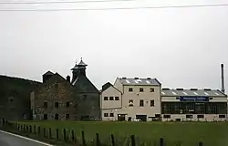 Nothing now remains of the station, signal box or siding however the entrance and car park area is still present and the line remains open.[8] The distillery branch was operated by a signal box located near the road overbridge on its western side with two short sidings and associated points lying parallel to the main line. The single track branch to the distillery had sidings that supplied the loading dock area.[4]