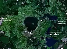 The Taupō Volcanic Zone (TVZ) is a volcanic area in the North Island of New Zealand that has been active for the past two million years and is still highly active. Mount Ruapehu marks its south-western end and the zone runs north-eastward through the Taupō and Rotorua areas and offshore into the Bay of Plenty. It is part of the larger Central Volcanic Region that extends further westward through the western Bay of Plenty to the eastern side of the Coromandel Peninsula and has been active for four million years.[1] At Taupō the volcanic zone is widening east–west at the rate of about 8 mm per year while at Mount Ruapehu it is only 2–4 mm per year but this has increases at the north eastern end at the Bay of Plenty coast to 10–15 mm per year.[2] It is named after Lake Taupō, the flooded caldera of the largest volcano in the zone, the Taupō Volcano.