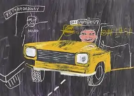 Taxi 45th/Broadway depicts a black man the labeled "NEGRO" as he unsuccessfully attempts to hail a cab at 45th Street and Broadway. Meanwhile, a white taxi driver ignores him and curses profanities. This scenario was a reality for Basquiat.[4] Despite his meteoric rise from a downtown street artist to a sensation of the New York art scene, he still faced discrimination due to his race. "Being black and a kid and having dreadlocks, he couldn't even get a taxi," Haring said.[5]