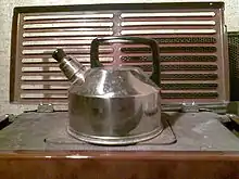 A modern stovetop kettle is a metal vessel, with a flat bottom, used to heat water on a stovetop or hob.[2] They usually have a handle on top, a spout, and a lid. Some also have a steam whistle that indicates when the water has reached boiling point.