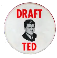 After his eldest brother's assassination, both he and Robert were floated as possible presidential candidates, with Lyndon B. Johnson concerned about the "Bobby problem".[10] However, the push for another Kennedy candidate was focused on Robert and only a Draft Bobby campaign was launched in 1964 that gained significant traction in the New Hampshire vice presidential primary, but failed elsewhere. In 1968 Robert ran a presidential campaign, against the advice of Ted who urged him to wait until 1972, that vied with Senator Eugene McCarthy in the Democratic primary until his assassination after winning the California primary.[11][12] Robert's delegates split and backed multiple different favorite sons and Ted was floated as a replacement for Robert with Governor Michael DiSalle pushing the idea.[13] However, the plan failed to gain traction and Ted only received 12.75 unsolicited delegates of Robert's 393.5 delegates. Ted also considered being the vice presidential nominee, but later declined.[14]