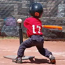 Tee-ball associations generally allow children between the ages of four and seven to play in their leagues.[1] A tee-ball coach sets the team lineup and fielding positions in the team's scorebook. The positions that get the most action in tee-ball are pitcher and first base, followed by the rest of the infield positions. In some leagues, catcher is also a special position due to the added gear that is worn; in other leagues, there is no catcher. In tee-ball, the pitcher is usually used for defensive purposes only, though gently pitched balls may be used with older or more advanced players in place of the fixed tee. The ball is placed on an adjustable tee atop the home plate at a suitable height for the batter to strike. (In some clubs, adult coaches give the batter an opportunity to try and hit a few pitched balls before going to the tee in the hope that this will further develop batting skills.)[2] Most of the other rules are similar or identical to those of baseball, though the game is played on a smaller field, typically one used for Little League or other youth baseball.[2] In addition, for the youngest tee-ball players, runs and outs are often not recorded, and every player gets to bat each inning.[1]