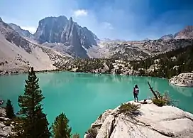 Temple Crag is a mountain peak in the Palisades group of peaks of the Sierra Nevada with an elevation of 12,982 feet (3,957 m). The peak lies east of the Sierra Crest, between Mount Gayley and Mount Alice, straddling the drainages of the North and South Forks of Big Pine Creek. The peak's north face forms the backdrop for part of the North Fork Big Pine Creek hiking trail in the John Muir Wilderness and Inyo National Forest. It is also a rock climbing destination, with its arêtes hosting the routes Venusian Blind, Moon Goddess Arete, Sun Ribbon Arete, and Dark Star.[6]