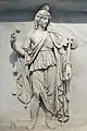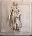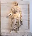 A series of marble pedestals and panels (24 in total so far) were found in proximity to the temple of Hadrian and have thus been thought to have formed a part of its decorative program.[3] According to Richardson, the face of the temple podium was broken into panels, whereby vertical plinths beneath the columns illustrated allegorical figures of the provinces of the empire in high relief, while framed panels under the intercolumniations bore simple trophies of armor and weapons but at a grander size.[2] Sixteen of the figures of provinces remain well preserved and are housed between five different collections in Rome and Naples.[2] They were carved in relief with personifications of cities and peoples from the Roman Empire, alternating with military and naval trophies.[3] The building materials employed were Proconnesian marble compatible with the order of the temple.[3] However, it is still debated whether or not those remains are directly from the Temple of Hadrian, or from other large public buildings that surrounded it.[3] Moreover, debate continues in regards to the identification of provinces that are illustrated as some argue that there were originally 25 in order to account for various personifications appearing on the coinage of Antoninus Pius, distinguishable for their costume and weapons.[2]