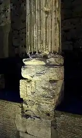 Inside the bank the remains of the non-apsidal naos can be seen, once covered by a barrel vault supported on columns between which were battle-trophies.[5] The base of the columns had reliefs of personifications of the provinces of the empire (some of which are now in the National Roman Museum and Capitoline Museums), demonstrating Hadrian's less warlike policy than his predecessor Trajan.[6][7][8][9][10]