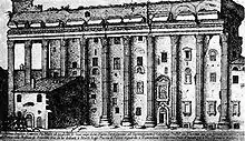 The Temple of Deified Hadrian was located within the Campus Martius (The Field of Mars) in close proximity to the earlier Solarium Augusti and later constructed Column of Marcus Aurelius. In the Notitia it is also listed as located in Regio IX near the Baths of Alexander Severus and Agrippa.[2] The temple of Matidia (Hadrian's mother-in-law) also likely stood just to the west of the Temple of Hadrian so it has further been argued for the presence of monumental entrances at both ends of the temple though the remains offer no confirmation.[2] The temple itself also stood within a spacious precinct surrounded by a colonnade, parts of which were uncovered by Rodolfo Lanciani in his early excavations of the surrounding spaces.[2]