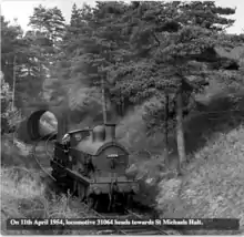 St. Michael's was little more than a halt station consisting of no more than a single platform made of sleepers and, for some time, a small corrugated iron hut which served as a ticket office.[5] So modest were the facilities that the wooden picket gate leading from the road for the use of passengers has been described as "more obvious than the halt itself".[6] By August 1938, the ticket office had closed and passengers were obliged to purchase their tickets on the train; the station had also become run-down and the track weed-strewn. It had fallen into a dangerous and decrepit state by 1953, the condition of the platform sleepers having seriously deteriorated.[7] Regular passenger services on the line were withdrawn after the last train on Saturday 2 January 1954.[8] The line was engineered and operated by Colonel H F Stephens. One of his 'bigger' feats was St Michaels Tunnel, located just north of the halt.[9]