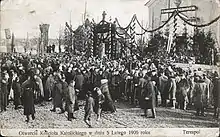 In the second half of the 17th century, Błotków with its ruined palace was purchased by Castellan of Vilnius Józef Bogusław Słuszka, who founded here a town, named Terespol after his wife, Teresa née Gosiewska. In 1697, Holy Trinity church was built here, soon afterwards, Dominican friars settled in Terespol. In 1748, Terespol became property of Grand Treasurer of Lithuania Georg Detlev von Flemming, who made great contribution to the development of the town, draining local swamps and building a number of dykes and canals. Furthermore, Flemming introduced a number of German settlers, and built a manor house in the location of the destroyed royal castle. In 1757, one weekly and two one-day annual fairs were established.[2] In 1764, Terespol was ransacked by private soldiers of Polish magnate Karol Stanisław "Panie Kochanku" Radziwiłł, who waged a personal war with Flemming for his support of the Czartoryski family. Later on the town passed to the Czartoryski family.[2][3]