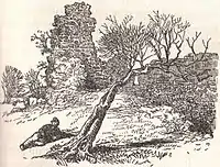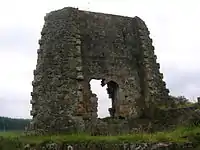 The small, irregular, octangular 14th-century vaulted tower has a splayed base[4][5] and is constructed of courses of square ashlar masonry,[6] 6 m (20 ft) high, with walls 2.0m thick, is the earliest part of the structure, together with the wide wall at the north-west. The tower was vaulted, with three ribs, and an entrance from the courtyard via a narrow passage leading to a partly surviving wheel-stair.[4] The remains of outbuildings lie to the north and a well was recorded within the keep; a sizeable courtyard lay within the complex.[7] The remains have seen some restoration[8] and the lines of excavation trenches are apparent. The whereabouts of the records of the late 19th-century excavations is not known for certain.[9]