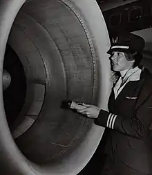 Rinehart graduated from San Jose State University (SJSU) in 1974.[3] In 1976, she was hired by Western Airlines, becoming the first woman airline pilot to work at the company.[4] At the time, she was one of 10 women who worked as pilots in airlines based in the United States.[4] She went on to fly as a captain for Delta Air Lines after it purchased Western Airlines.[1] She started flying the Boeing 737, and later flew the 757 and 767.[5] Rinehart also has a helicopter pilots license and is a Whirly Girl.[1] Rinehart's husband, Bob Rinehart, is also a pilot, and their three children later went into the aviation field.[5]