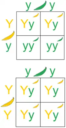 In a test cross, the individual in question is bred with another individual that is homozygous for the recessive trait and the offspring of the test cross are examined.[2] Since the homozygous recessive individual can only pass on recessive alleles, the allele the individual in question passes on determines the phenotype of the offspring.[3] Thus, this test yields 2 possible situations: