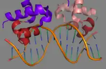 The DNA-binding domains of TetR recognize a 15 base pair palindromic sequence of the TetA operator.[1][5] These domains mainly consist of a helix-turn-helix (HTH) motif that is common in TetR protein family members (see below). However, the N-terminal residues preceding this motif have also been shown to be important for DNA binding.[6] Although these residues do not directly contact the DNA, they pack against the HTH and this packing is essential for binding. The HTH motifs have mostly hydrophobic interactions with major grooves of the target DNA.[1] Binding of TetR to its target DNA sequence causes changes in both the DNA and TetR.[7] TetR causes widening of the major grooves as well as kinking of the DNA; one helix of the HTH motif of TetR adopts a 310 helical turn as the result of complex DNA interactions.