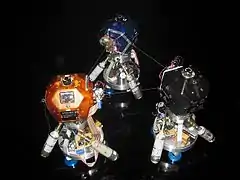 The MIT Space Systems Laboratory[2] conducted ground experiments that tested a fully decentralized nonlinear control law, which eliminates the need for inter-satellite communications.[3] Contraction theory[4] was used to prove that a nonlinear control law stabilizing a single-tethered spacecraft can also stabilize arbitrarily large circular arrays of tethered spacecraft, as well as a three-spacecraft inline configuration. In order to validate the effectiveness of the decentralized control and estimation framework, a new suite of hardware has been designed and added to the SPHERES (Synchronize Position Hold Engage and Reorient Experimental Satellite) testbed. A 2007 PhD thesis introduced a novel relative attitude estimator, in which a series of Kalman filters incorporate the gyro, force-torque sensor, and relative distance measurements.[5] The closed-loop control experiments can be viewed at .[6] The MIT team also reported the first propellant-free underactuated control results for tethered formation flight. This is motivated by a controllability analysis that indicates that both array resizing and spin-up are fully controllable by the reaction wheels and the tether motor.[7][8]
