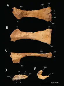 The holotype, FSAC-OB 1, was found in the middle Couche III, itself the lowest phosphate layer complex at Sidi Daoui, dating from the late Maastrichtian. It consists of a left humerus. The bone is relatively crushed. Other specimens have been referred to the species. FSAC-OB 199 is an ulna. FSAC-OB 200 is another ulna. FSAC-OB 201 is a thighbone. FSAC-OB 202 consists of a thighbone with shinbone. The describing authors admitted that a connection between the holotype and the referred specimens is hard to prove, in view of the lack of overlapping material. However, the wide ulnae fit the exceptional distal width of the humerus. The thighbones were, more tentatively, referred because they seemed to be pteranodontid.[1]