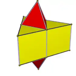 ![]() An orthographic projection showing the pair of parallel tetrahedra projected as a quadrilateral divided into yellow and blue triangular faces. Each tetrahedra also have two other uncolored triangles across the opposite diagonal. |