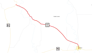SH 127 begins in Sabinal at an intersection with US 90 and RM 187.[2] The highway travels north through Sabinal along Center Street, concurrent with RM 187, before separating from that route and turning toward the northwest. After crossing the Sabinal River, the highway travels through unincorporated Uvalde County, intersecting FM 30, FM 1049, and FM 2690.[3] The route crosses the Frio River at Concan before ending at a junction with US 83.[4]