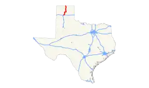 State Highway 136 (SH 136) is a Texas state highway that runs from the Texas–Oklahoma border south of Guymon, Oklahoma to Amarillo. The route was designated on January 23, 1929 from Amarillo to Oklahoma.[2][3] On March 19, 1930, the route was truncated to Stinnett, with the portion north of Stinnett transferred to SH 117. On February 4, 1941, the section of SH 136 from the Moore/Potter County Line to Stinnett was cancelled. On September 22, 1942, the route was extended east to Borger. The highway was extended to the Oklahoma border on November 21, 1963, replacing most of FM 278 and all of FM 2216.