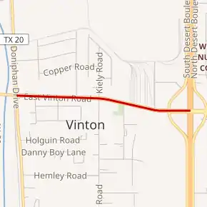 The western terminus of Spur 37 is at SH 20 (Doniphan Rd.) in Vinton. The route travels east along Vinton Rd. before ending at exit 2 on I-10.[1][2]