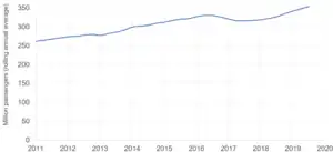 Passenger numbers on Govia Thameslink Railway (which also includes Southern and Gatwick Express) have risen from 262 million annually in 2010–11 to 327 million annually in 2015–16.[49]