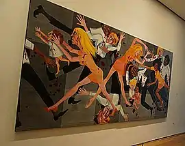 The American People Series #20: Die is a 1967 oil on canvas painting by American artist Faith Ringgold.[2] Inspired by Pablo Picasso's painting Guernica (1937) and painted amidst the riots and uprisings of the 1960s, Die is a two-panel work depicting a group of Black and white men, women, and children, most of whom are wounded or covered in blood, variously fighting, fleeing, or dying against an abstract grey background.[1][3] The piece has been extensively cited as among Ringgold's most important and iconic artworks.[3][4][5]