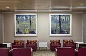 The Arrival is a 2013 installation by Casey Roberts, which consists of a patterned glass wall and door and two paintings. The wall, which measured 78.25" x 262", framed, consists of two panels of glass that have been fused together, and then decorated with both semi-translucent and opaque decoration, including trees and new and budding plants, creating a frosted effect.[1] The paintings, both which measure 69.5" square, framed, were created by painting paper with cyanotype chemicals before completing the work with additional painting and flower collage.[1][2] Of the work's imagery, the artist comments: