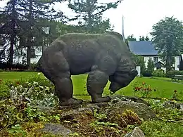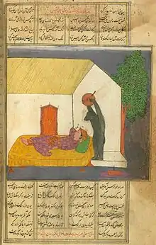 Because of the fable's existence in Eastern sources, it has been a particularly popular subject in Muslim miniatures from the East. Most often they depict the bear with the stone raised in its paws, as in the manuscript copy of the Masnavi dating from 1663 in the Walters Art Museum (see above), and another illustration from Persia dating from a little later.[15] A watercolour in Lucknow style, painted by Sital Das round about 1780 and now in the British Library, shows the bear contemplating the gardener after it has killed him.[16] Yet another Indian miniature of the fable was among those commissioned from the Punjabi artist Imam Bakhsh Lahori in 1837 by a French enthusiast of fables. Now in the Musée Jean de la Fontaine, it shows the bear in an ornamental garden.[17]