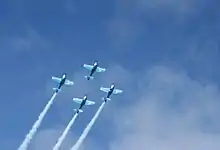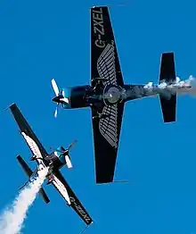 The team fly four Extra 300LPs and an Extra 330SC, the latter being used for solo sections of the performances.[7] These two-seated propeller aircraft are used for four plane displays as well as corporate flying events during which passengers can be carried on board.[8] The aircraft were originally painted orange and black but later changed to light blue and black. By 2013 they had reverted to the orange and black colour scheme.