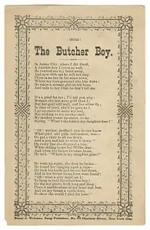 "The Butcher’s Boy" or "The Butcher Boy" (Laws P24, Roud 409) is an American folk song derived from traditional English ballads.[1][2] Folklorists of the early 20th century considered it to be a conglomeration of several English broadside ballads, tracing its stanzas to "Sheffield Park", "The Squire's Daughter", "A Brisk Young Soldier", "A Brisk Young Sailor" and "Sweet William (The Sailor Boy)"[3][4] and "Died for Love".