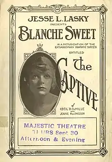 The Captive is an American silent-era film released on April 22, 1915. It was released on five reels.[2] The film was written, directed, edited, and produced by Cecil B. DeMille. Jesse L. Lasky was another producer and Jeanie MacPherson worked with DeMille to write the screenplay. The film is based on a play written by Cecil B. DeMille and Jeanie MacPherson. The Captive grossed over $56,000[3] on a budget of $12,154.[4] Blanche Sweet stars as Sonia Martinovich, alongside House Peters who stars as Mahmud Hassan. The film details the romantic war-era plight of Sonia and her lover Mahmud.