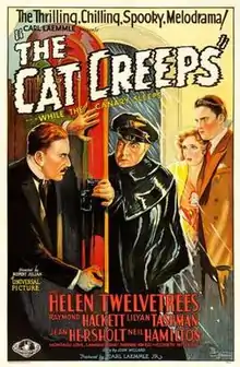 The Cat Creeps is a 1930 American pre-Code mystery film directed by Rupert Julian based on the 1922 play The Cat and the Canary by John Willard. The film is a sound remake of The Cat and the Canary (1927).[2] Starring Helen Twelvetrees, Raymond Hackett, Neil Hamilton, Lilyan Tashman, Jean Hersholt, Elizabeth Patterson, and Montagu Love.