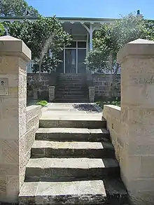 The garden surrounds the house on the southern, western and northern sides. Its main extent is to the west. Broad sandstone steps lead from Yerton Avenue into the garden. More steps lead to the house's wide front verandah. A billowing shrubbery fills the front (south) and side (west) garden, and on the side gate an old steel helmet hung (in 1979 under Heysen's occupation).[1]