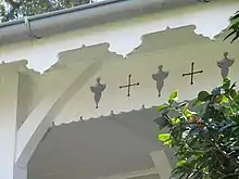 The timber components were reputedly numbered with "code markings like roman numerals" as was common practice.[3]: 47 Dowel fixings were used. The extent to which evidence of this construction has survived has not been determined. Photographs of the exterior of the building show that the prefabrication is evident in the sidewalls. The veranda appears to have its own structure, with cross bracing to the supporting posts and into the front walls of the house, an unusual detail for Australia. The outer layer of fretwork to the veranda conceals the ends of the rafters, a practical detail that protects them from water entry.[1]