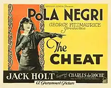 The Cheat is a 1923 American silent drama film produced by Famous Players-Lasky and distributed by Paramount Pictures, and is a remake of Cecil B. DeMille's 1915 film of the same name using the same script by Hector Turnbull and Jeanie MacPherson. This version stars Pola Negri and was directed by George Fitzmaurice.[1][2][3]