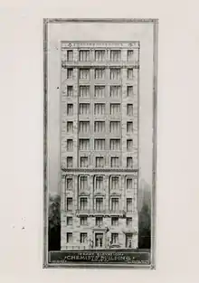 The Chemists' building at 52 East 41st Street, New York City, New York, United States was built by the architects York and Sawyer, replacing previous numbers 50-54. York and Sawyer filed the plans in January 1910[2] and completed the work in March 1911. The building opened on March 17, 1911.[1]: 6–7 Several days of events were held to celebrate the opening. A number of scientific papers were presented, ranging from "The characteristics of living matter from the physico-chemical point of view" by Jacques Loeb to "The chemistry of phosphorescence" by Wilder Dwight Bancroft and "The contributions of chemistry to sanitation" by William P. Mason.[7]: 20