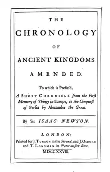 The Chronology of Ancient Kingdoms Amended is an approximately 87,000-word composition written by Sir Isaac Newton, first published posthumously in 1728.[1] Since then it has been republished. The work represents one of Newton's forays into the topic of chronology, detailing the rise and history of various ancient kingdoms throughout antiquity.