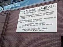 The Citadel Bulldogs baseball team represents The Citadel in college baseball. They are classified as NCAA Division I and play in the Southern Conference. The Bulldogs are led by Tony Skole, who will lead his first season in 2018.[2][3] They made their one appearance in the College World Series in 1990. They are the first and through 2016 only military school to appear in the College World Series. The Citadel has claimed eight Southern Conference Baseball Tournament titles and produced seven major league players.
