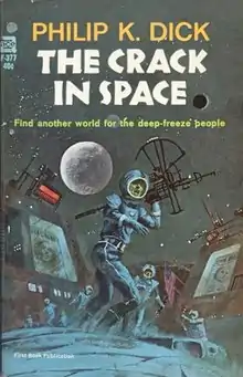 The Crack in Space is a 1966 science fiction novel by American writer Philip K. Dick. In the United Kingdom, it has been published under the title of the original novella, Cantata 140, published in the July 1964 issue of The Magazine of Fantasy & Science Fiction.[1] This original title refers to the short title in English, Sleepers Awake, of J.S. Bach's Cantata BWV 140 and the novel's 'bibs', the millions sleeping in suspended animation. Both are based on the short story Prominent Author. The common elements are the Jiffi-scuttler transport device, the company, Terran Development, that manufactures it (and still exists to play a large role in the later works), and a brief summary of Prominent Author as an event of the past in chapter 2. The "crack in space" is a defect in Jiffi-scuttler operation that allows access to the earth (in Prominent Author) and to parallel earths (in the later works) at various times and locations, beyond its intended use of providing near-instant transport between specific locations on the earth in the present.