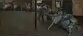 The Metropolitan Museum of Art owns a painting titled Dancers in the Rehearsal Room with a Double Bass, dated 1882–85, which is possibly the second painting in the sequence.[6] Another painting from the sequence, Before the Ballet (1890/1892), is also in the National Gallery of Art.,[7] and Ballet Rehearsal (La salle de danse, c.1885) is in the Yale University Art Gallery.[8] When placed side by side in a frieze format, the paintings take on a decorative aspect although were not originally intended to be hung this way.[9] It has been suggested that the 40-odd paintings collectively show how Degas examined his theory that the "intervals between figures and space were the basis for creating ornament".[9]