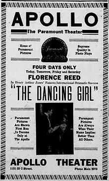 The Dancing Girl is a lost 1915 silent film drama produced by the Famous Players Film Company and distributed by Paramount Pictures. It is based on the 1891 Broadway play of the same name by Henry Arthur Jones. The film was directed by Allan Dwan and starred stage actress Florence Reed in her film debut. Reed's husband, Malcolm Williams, also appears in the film.[1][2]