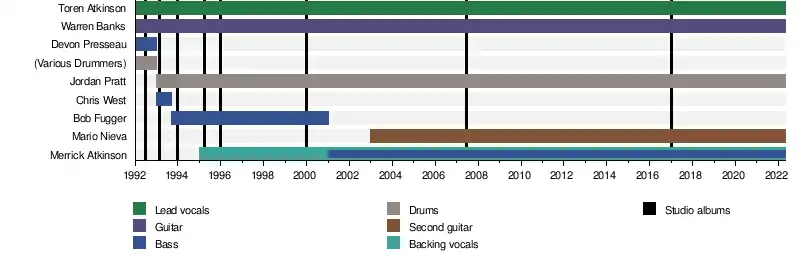 The original three members of the band, at the January 1992 formation, were Toren Atkinson, Warren Banks and Quentin Rogers. Quentin, though, never appeared on any of their releases, nor played at any of their public performances. The first bass player to appear with the band at a show was Devon Presseau.[43] The band has gone through several bassists and drummers since its inception. Thomas R. Falk has toured and played with the band as a second guitarist.