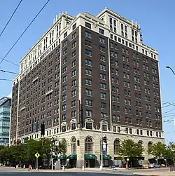 Opened on November 16, 1929,[2] the Dayton Biltmore Hotel was designed in the Beaux-Arts style popular at the time.[3] It features an applied masonry façade system, exhibiting both brick and terra cotta, resulting in a dark brown and white exterior.[3] The architect, Frederick Hughes (of the architecture firm F.J. Hughes and Company), is also known for the nearby Commodore Apartments and the Centre City Building, which were designed in a similar style.[4] One of the tallest buildings in Dayton, the Biltmore was considered one of the finest hotels in America, playing host to some of the nation's most powerful and celebrated men in the 20th century, such as John F. Kennedy and Elvis Presley.[5]