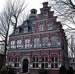 The Dutch House is a historic multi-unit residential building at 20 Netherlands Road in Brookline, Massachusetts. This four-story brick building was originally built as an exhibition hall at the 1893 World's Fair in Chicago, where it served as the Dutch Cocoa House. It is a close copy of the Franeker City Hall in Franeker, Netherlands. The door frame, embellished with stone animals, is a replica of the Enkhuizen Orphanage. The building's interior is highly ornate, with massive ceiling beams and Flemish wooden panels. The original dining room included classic blue and white Delftware tiles, some more than 300 years old. The exterior has a high mansard roof that extends over two floors, and has stepped gables. The windows include more than 12,000 individual lights of leaded green glass.[2]