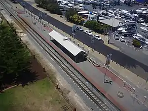 For the staging of the 1987 America's Cup, the existing narrow and standard gauge tracks were combined as one dual gauge line with three temporary stations erected, one of which was The Esplanade. Between October 1986 and February 1987, the Hotham Valley Railway operated a daily service on this section of the line with a W class steam locomotive as the Spinnaker Run.[2] This was supplemented by Transperth special services. Having not been used since, the station was demolished in September 2018.[3][4]