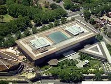The Field, held August 21–September 28, 1968, was the inaugural exhibition at the National Gallery of Victoria’s new premises on St Kilda Road,[1] launched by the director of London’s Tate gallery, Norman Reid,[2] before an audience of 1000 invitees. Hailed then,[3][4] and regarded since as a landmark exhibition in Australian art history,[5] it presented the first comprehensive display of colour field painting and abstract sculpture in the country in a radical presentation, between silver foil–covered walls and under geometric light fittings, of 74 works by 40 artists. All practised hard-edge, geometric, colour and flat abstraction, often in novel media including coloured or transparent plastic, fluorescent acrylic paints,[6] steel and chrome. The art was appropriate to a launch of the new venue itself, designed by architect Roy Grounds, and emphatically rectilinear; cubes nested in a basalt rectangular box amongst the other buildings of the new Arts Centre, each based on a geometric solid. Echoing emerging international stylistic tendencies of the time, The Field sparked immediate controversy and launched the careers of a new generation of Australian artists.
