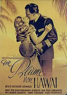 The Flower of Hawaii (German: Die Blume von Hawaii) is a 1933 German musical film directed by Richard Oswald and starring Mártha Eggerth and Iván Petrovich.[1] It is an adaptation of the operetta The Flower of Hawaii by Paul Abraham. The operetta was later adapted again for a 1953 film. It is based on the life of the last Queen of Hawaii, Liliuokalani.