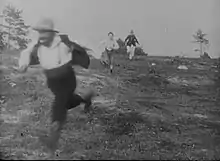 The final scene consists of three shots showing a second chase in the forest. The poacher is finally cornered at the very place where he had killed the game-keeper. The boy stabs him and the poacher falls into the ravine. The policemen join the boy and congratulate him.[1]