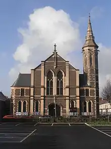 The Gate is housed in a Grade II listed church building, formerly the Plasnewydd Presbyterian Church and school hall. It is located in Keppoch Street overlooking Plasnewydd Square in the Roath area of Cardiff. The school hall was built in 1886 and the church was added in 1901 to the designs of architect W. Beddoe Rees in collaboration with J. H. James.[1] In a Gothic style, the church has three bays to the front and four bays facing Keppoch Street. A polygonal bell tower is on the street corner.[1] The main body of the church had (and still has) galleries on three sides, supported by iron columns with classical capitals.[1] The building was received a heritage listing of Grade II in 1998, being a prominent, finely detailed church by an important architect.[1]