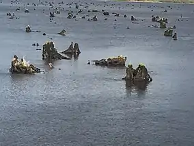 It was until recently densely populated with ancient oak trees and the last surviving full oak forest in western Europe. Its Irish name is An Gaorthadh (meaning "the wooded river-valley" or "the river-bed"). [3] Author Seamus O'Donoghue provides another Irish name, An Gaoire, derived from the Irish word Gaorthadh.[4] The area was flooded in 1954 to facilitate the building of two hydro-electric dams in Carrigadrohid and Inniscarra, which provide electricity for the nearby city of Cork. The area is now part of the plants' upper reservoir. The development required the flooding of the region; consequently, hundreds of trees were felled and many people were relocated. Many of the trees were centuries old and had grown since the medieval period.[5] Today only their stumps survive, in flood land, giving the area a ghostly and almost lunar appearance.[4]