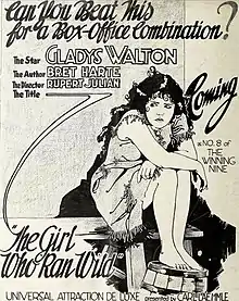 The Girl Who Ran Wild is a 1922 American comedy-drama film directed by Rupert Julian. It is a black and white silent film released by Universal which is based on the 1863 novella M’liss: An Idyll of Red Mountain by Bret Harte.[1] It is a remake of the 1918 film M’Liss.[2] The film was written by George C. Hull and features cast such as Gladys Walton (as M’liss), Marc Robbins (“Bummer” Smith), and Vernon Steele (The Schoolmaster). It is a western melodrama which was released on October 9, 1922.[3][4] It was filmed in Seven Oaks, California.[5]